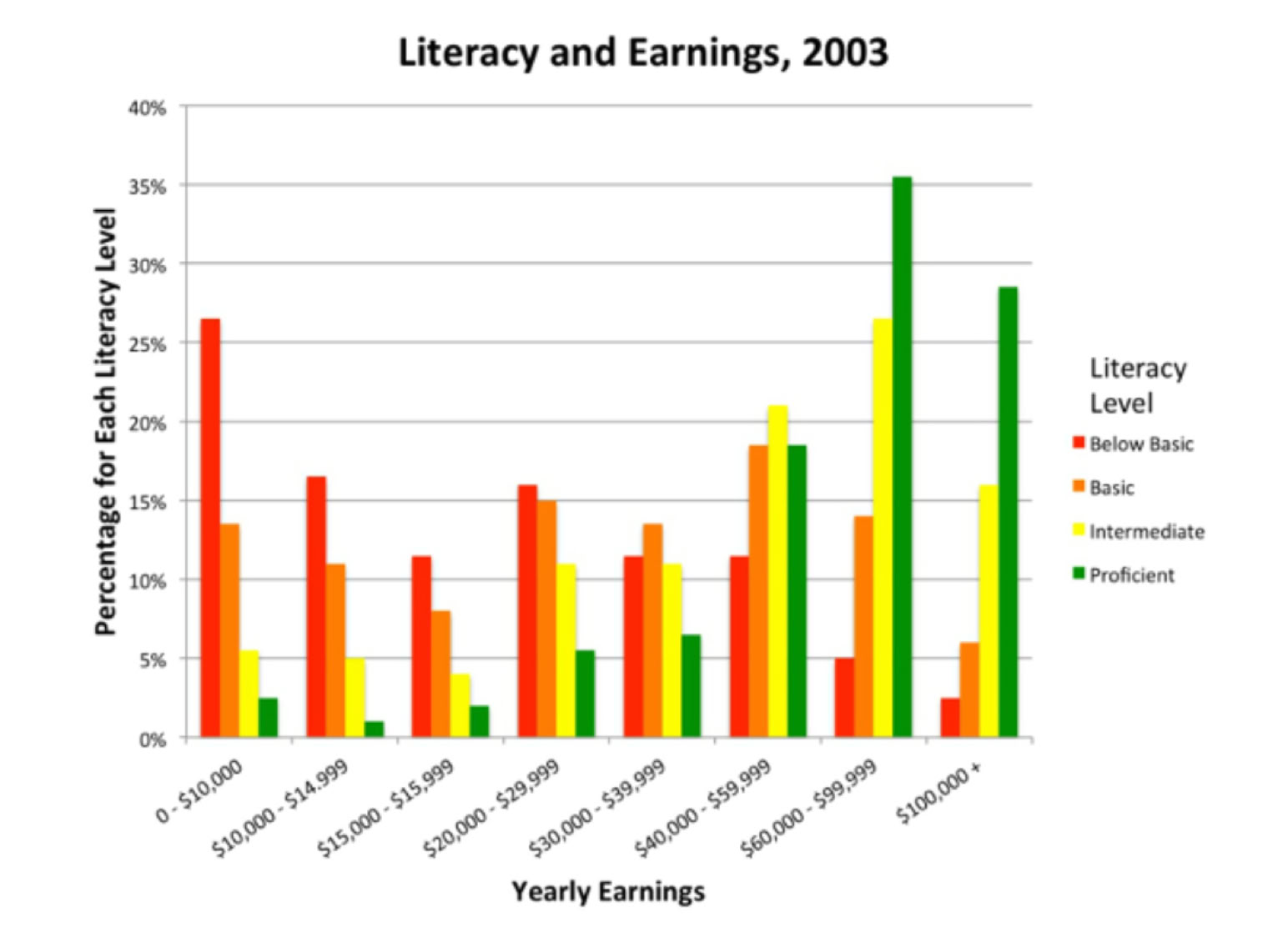 This graph is based on data from the 2003 National Assessment of Adult Literacy 2007 report, "Literacy in Everyday Life," Chapter 2, page 32, table 2-3.